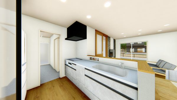 買い物帰りの荷物も収納しやすい、玄関に近い配置の対面キッチン🍽️帰宅した人が必ず前を通るから、「ただいま」「おかえり」の声掛けもしやすくなります🙌