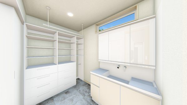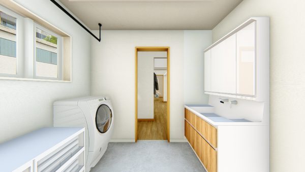 洗面・脱衣・選択をココだけで完結できる多機能な洗面ランドリー。3帖の広さに室内物干しも備え、天候を気にせずにいつでも洗濯物を干すことができるのも魅力です。