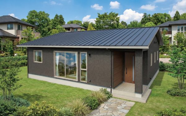 シンプルな切妻屋根の平屋に、カタチの異なる3つの窓を並べて、おしゃれなアクセントに。子育てを楽しみながら、老後も安心して暮らせるようにと、本当に必要なスペースだけを選び、28帖のワンフロアに仕上げました。