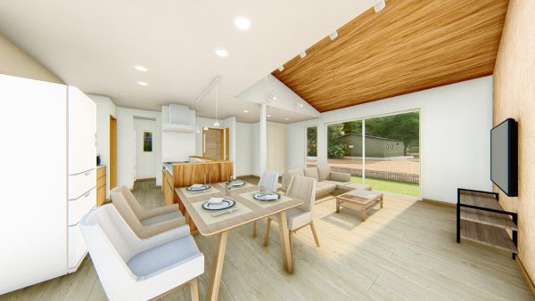 リビングに面したフリースペースと一体に使うと、25帖越えのLDK。リビングは勾配天井にして伸びやかな広がりをプラス。南向きの窓から心地いい光と風も取り込めます。