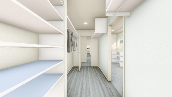 キッチン横から、洗面→脱衣室→ランドリールーム→ファミリークローゼット→リビングへと回遊できる動線を採用