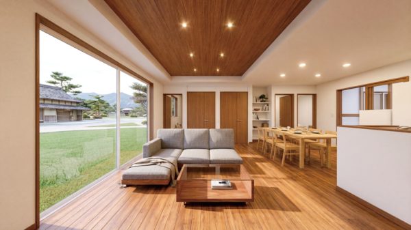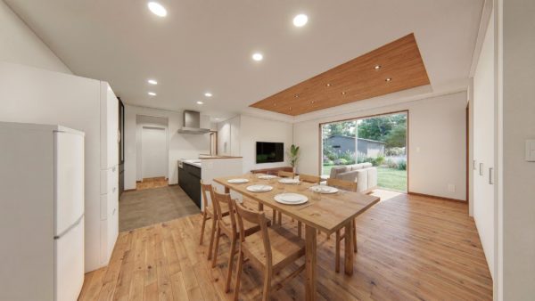 ゆったり22帖のLDKは、平屋だからこそ実現できる広大なリビング空間が魅力。一部を折り上げ天井にしてメリハリを付けるとともに、開放感も高めています。