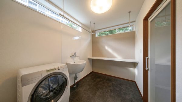 玄関ホール直通の脱衣室兼ランドリーで、衛生面もバッチリ。スロップシンク・室内物干し・カウンター・収納完備で、洗う・干す・しまうをココだけで完結できます。