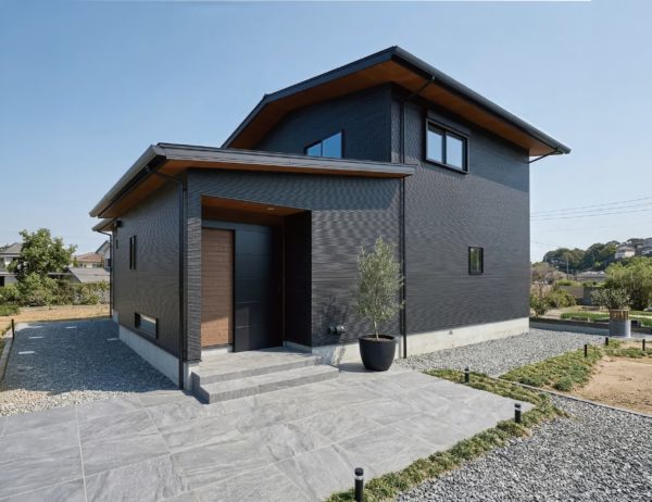 モダンな趣と飽きの来ないシンプルな機能美が融合した外観。長く伸ばしたケラバが外壁を守り、西側の屋根には5.76kWの太陽光パネルを搭載。家計にも環境にも優しい長期優良住宅です。