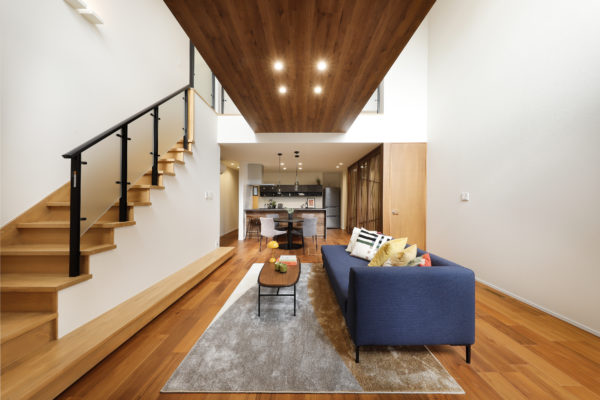 1階と2階が吹き抜けでつながる明るいLDK。吹き抜けを木目にして温かみをプラスしました。憩いの小上がりの和室など家族が集まる工夫をしました。