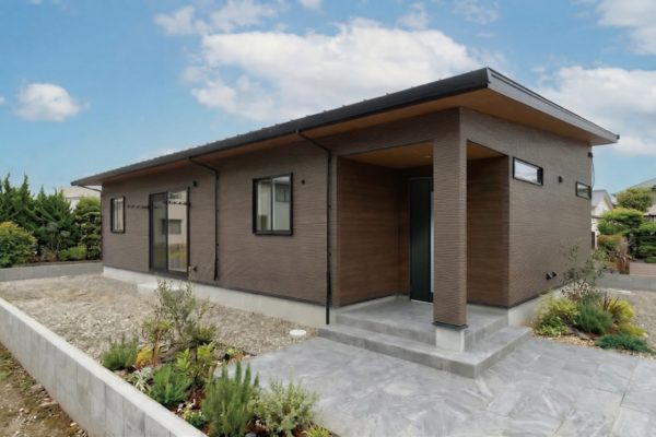 スマートな平屋のフォルムに、玄関周りと軒天の木目がナチュラルな趣を添える外観。片流れの屋根に7.2kWの太陽光パネルを搭載。C値0.15の高気密性を備えた長期優良住宅です。
