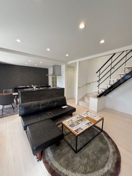 黒と白を基調にした洗練された見渡しのいいLDK。格子でさりげなく仕切った小上がりのタタミコーナーが空間にメリハリを与えてくれます。