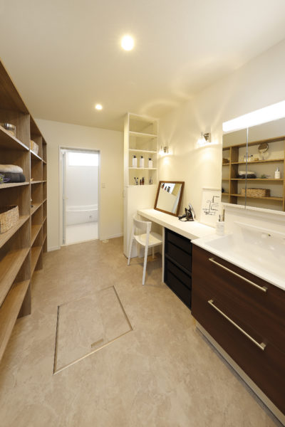 洗面クローゼットは、室内物干しを完備し、洗濯物を洗う・干す・しまうをここだけで完結できます。