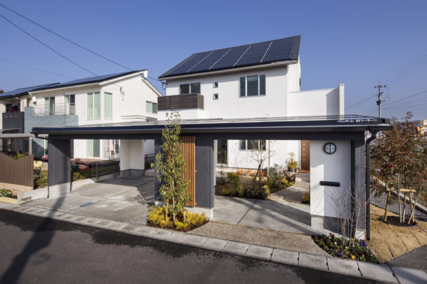 モノトーンの外装に、木目軒天がナチュラルな趣を添える外観。