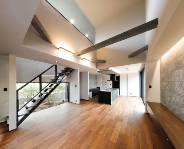 家族でくつろぎ、緑と石の調和を楽しむ大空間LDKと