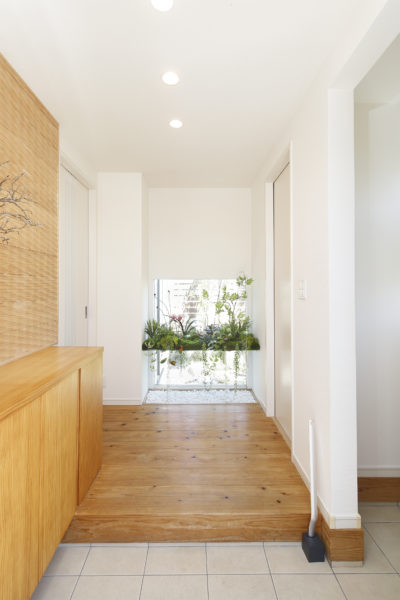 玄関は、ホール直通の来客用動線と、収納を通過する家族用動線の2WAY動線。