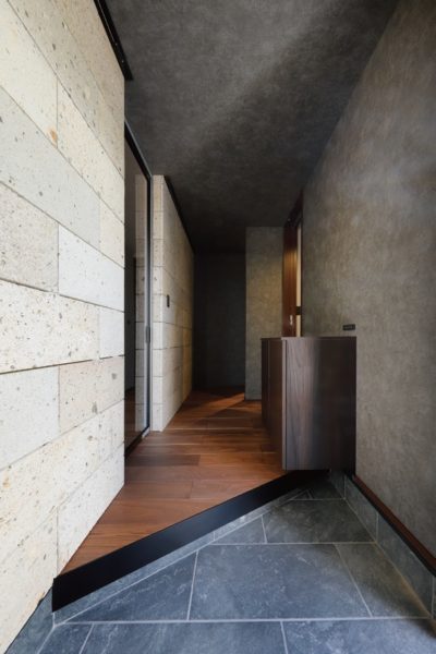 地元で採れた天然石「加治木石」を壁一面に敷き詰めた玄関。