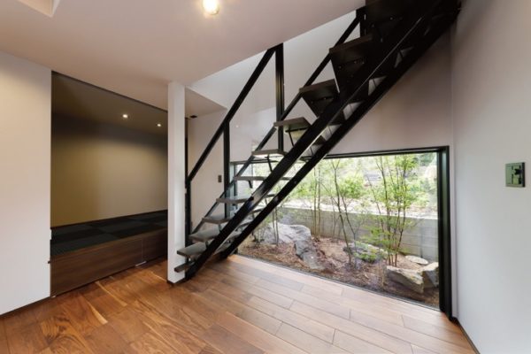 リビングのスリット階段下に配置された窓から眺める坪庭は、植栽が映える桜島の溶岩石を使用。