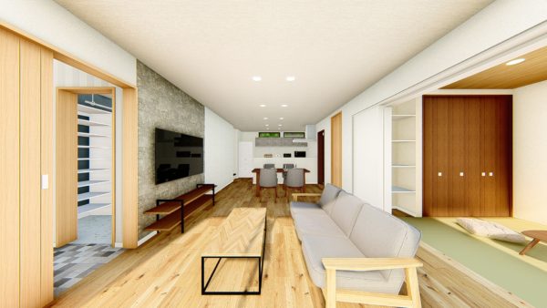 和室とつなげると約23帖の広さになるLDKは、キッチンからリビングまで一直線につながる見通しのいい空間✨家族のコミュニケーションも円滑になります🤗