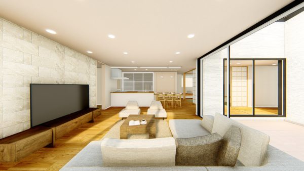 広々約24帖のLDKはテラスや和室、主寝室、子ども室、洗面室とつながる開放的な大空間。明るい光が入る格別な空間です。