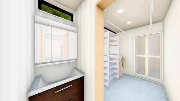 ランドリーは、室内干しでも乾きやすい七呂建設の特徴を活かした設計。