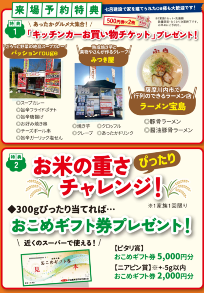 「キッチンカーお買い物チケットプレゼント!」と「お米の重さぴったりチャレンジ!」も開催します!