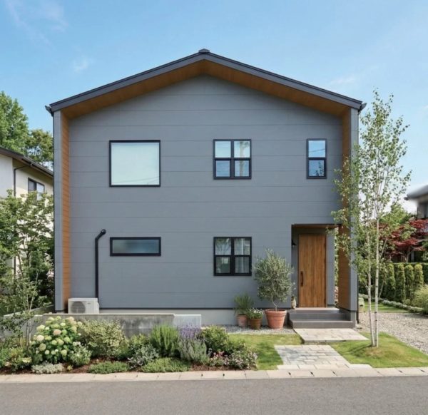 住宅街で目を引くシンプルモダンな三角屋根と軒ゼロ外観がおしゃれな2階建てのお家。