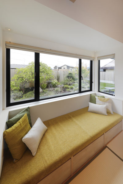 前後に庭をのぞむ癒しの景色とスプーンカットの床の足触りに